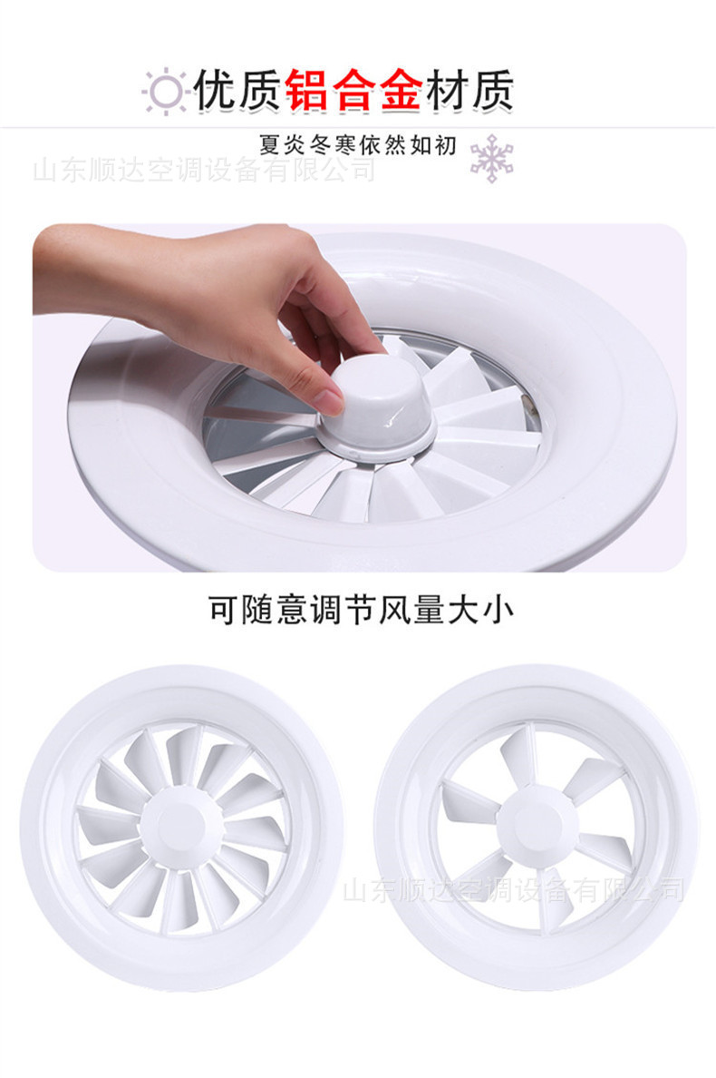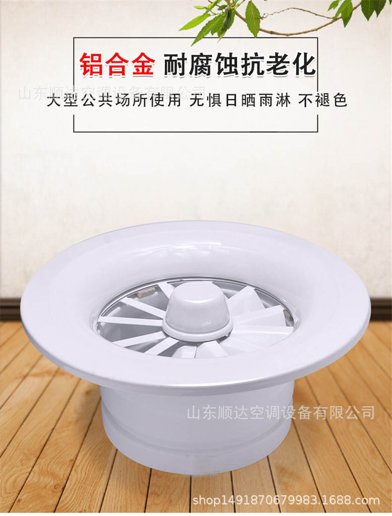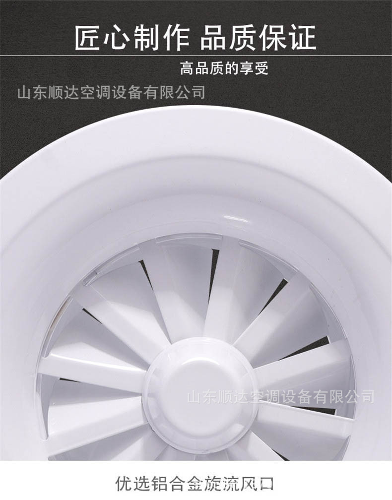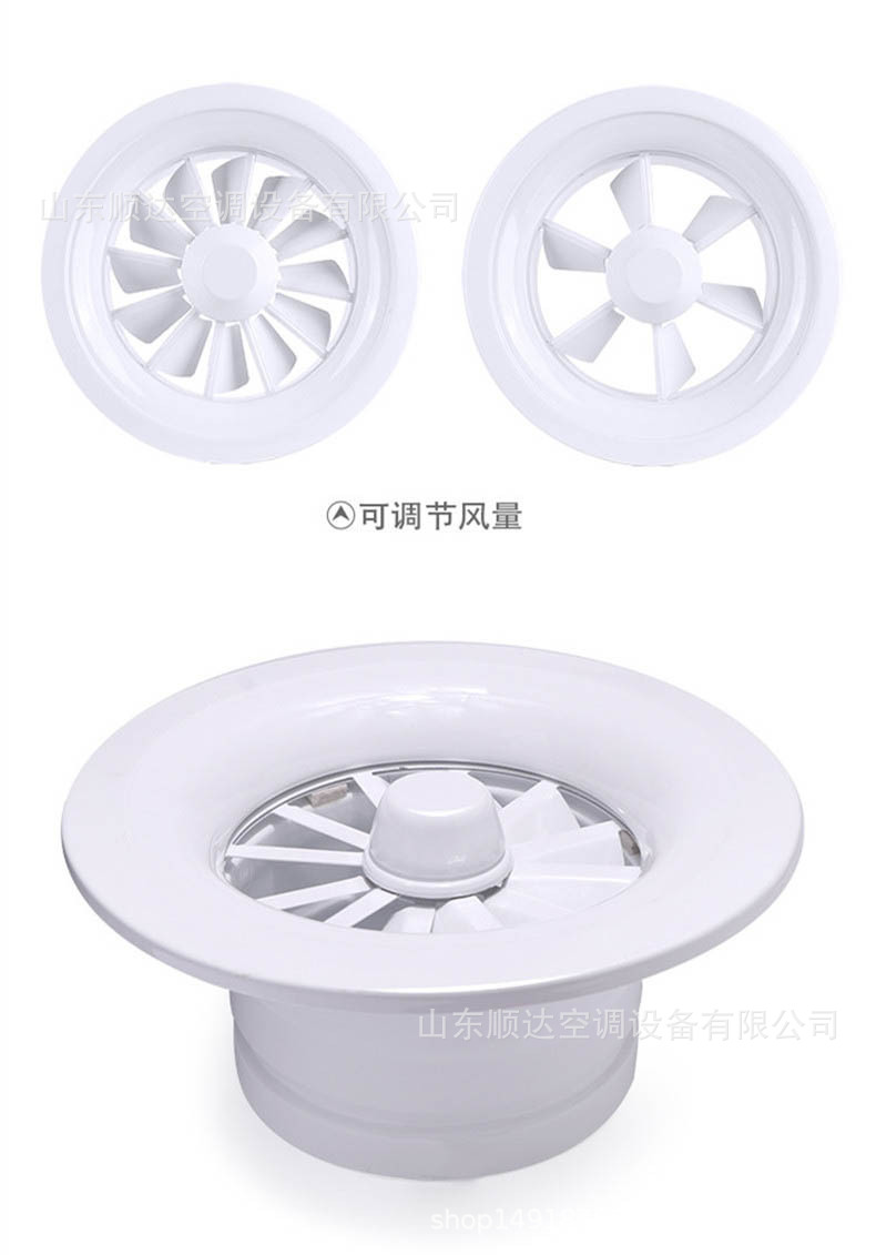 旋流風口是空調系統中的一個排風工具。在空調通風系統中可用作大風量,大溫差送風以減少風口數量,安裝在天花板或頂棚上,可用于3米以內低空間,也可用二種高度大面積送風,高度甚至可達10米以上。 旋流風口送出旋轉射流,具有誘導比大,風速衰減快的特點。 ■材質:不銹鋼,鋼板,鋁合金 ■規格尺寸:支持定制,配合設計尺寸