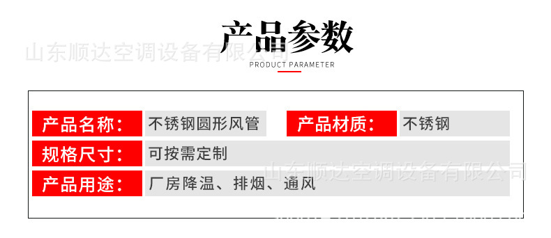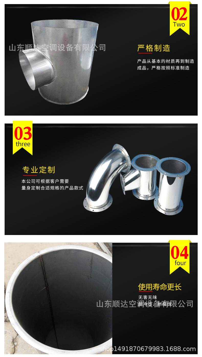 不銹鋼風管,不銹鋼風管可分為圓形和矩形兩種。可根據工程現場的不同要求,生產各種形狀、各種規格型號及板材的成品風管。不銹鋼風管主要材質有:SUS304、316、303、310、310S、301、302、304L、316L 、321、201、202、902、904、317、430等。不銹鋼風管表面性質主要有8K鏡面板、彩色不銹鋼板、不銹鋼磨砂板、不銹鋼拉絲板、不銹鋼花紋板、不銹鋼蝕刻板、鈦金、雪花砂、2B板、BA板和工業 [1] 中厚板。不銹鋼風管成品因其優異的耐蝕性、耐熱性、高強度等物化性能,主要應用于多種氣密性要求較高的工藝排氣系統、溶劑排氣系統、有機排氣系統、廢氣排氣系統及普通排氣系統室外部分、濕熱排氣系統、排煙除塵系統等。