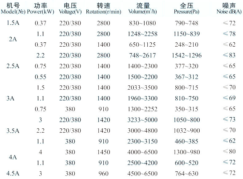 4-72型離心式通風機可輸送空氣和其他不自燃的、對人體無害的、對鋼材無腐蝕性的氣體。氣體內不允許有粘性物質,所含塵土及硬質顆粒物不大于150mg/立方。氣體溫度不得超過80°C。該風機具有良好的氣動性能、運轉平衡、振動小、效率高、壽命長等特點。廣泛適用于工礦企業、大型建筑物、賓館酒樓等室內通氣換氣。B4-72型防爆型離心式通風機、主要有鋁葉輪、機殼、進風口等部分與防暴電機組成、可作為易燃揮發性氣體的通風換氣只用、其性能和安裝尺寸同于4-72型。F4-72型為防腐型離心式通風機,主要用不銹鋼(或玻璃鋼)材質制成的葉輪、機殼、進風口等部分與電機組成,可用于輸送腐蝕性氣體,其性能與安裝尺寸同于4-72型。